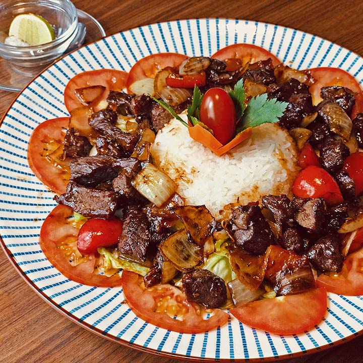 • Tender beef in cube-shaped served jasmine rice, salad, tomatoes and lime-salt-pepper-sauce Vietnamese style.