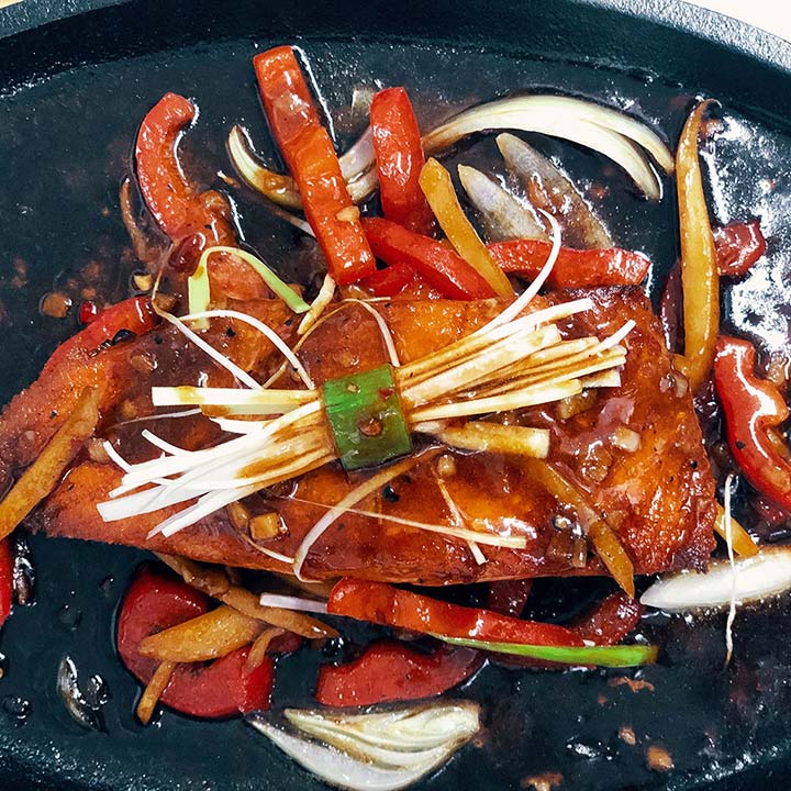 • Grilled salmon fillet with ginger, pepper, chili in special-sauce on warm plate served with jasmine rice.