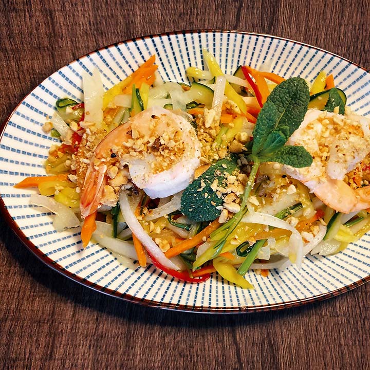 • Mango, Kohlrabi, Karotten und Gurken mit Garnelen verfeinert mit frischen Kräutern, Erdnuss dazu Krabben Chips und Nuoc-Mam Soße.